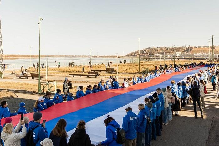 500 нижегородцев развернули на Стрелке стометровый российский триколор в честь годовщины воссоединения Крыма с Россией