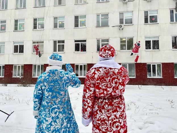 Спасатели устроили сюрприз для детей, неожиданно появившись в окнах их палат в костюмах Дедов Морозов. Пока альпинисты спускались с крыш двух корпусов больницы с помощью специального снаряжения, Дед Мороз-пожарный вместе со Снегурочкой заглядывали в окна палат, поднимаясь к ним с помощью коленчатого подъемника.