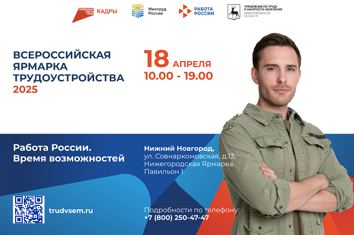 Программа мероприятий регионального этапа Всероссийской ярмарки трудоустройства Нижегородской области доступна на портале Нижегородского кадрового центра «Работа России»: https://trud-nnov.ru/vserossiyskaya-yarmarka-trudoustroystva-2025.php.
