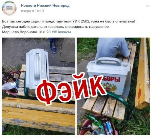 По информации председателя участковой избирательной комиссии №2502, урны, изображенные на фото, участковой комиссией не используются. При голосовании вне избирательного участка применяются переносные урны другого вида и с иным оформлением. Так называемая девушка-наблюдатель, на которую ссылается автор сообщения, не является официальным наблюдателем, имеющим аккредитацию Общественной палаты Нижегородской области, и не имеет права представляться официальным наблюдателем. Ситуационный центр квалифицировал данную публикацию как фейк.