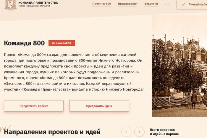 «Команда 800» - это отдельный раздел на портале «Команда Правительства» (ссылка на раздел https://hr.government-nnov.ru/ru-RU/project800/promo). Главная задача проекта – вовлечь жителей Нижнего Новгорода в подготовку к празднованию 800-летия города. Для того, чтобы зайти на портал «Команды Правительства», стать участником «Команды 800», предложить идеи и проекты не нужно проходить сложной регистрации. Достаточно иметь профиль на «Госуслугах».