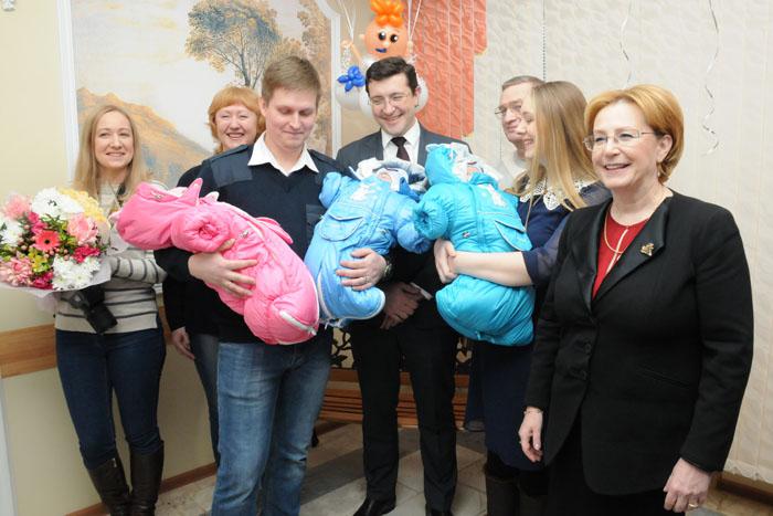 Вместе с министром здравоохранения России Вероникой Скворцовой, которая 26 февраля приехала с визитом в Нижний Новгород, врио губернатора Глеб Никитин посетил родильный дом городской клинической больницы №40 Автозаводского района. Именно в этом роддоме в январе появились на свет тройняшки. В семье нижегородцев Анастасии и Павла Гришиных родились два мальчика и девочка, которых назвали: Тимофей, Дмитрий и Арина.