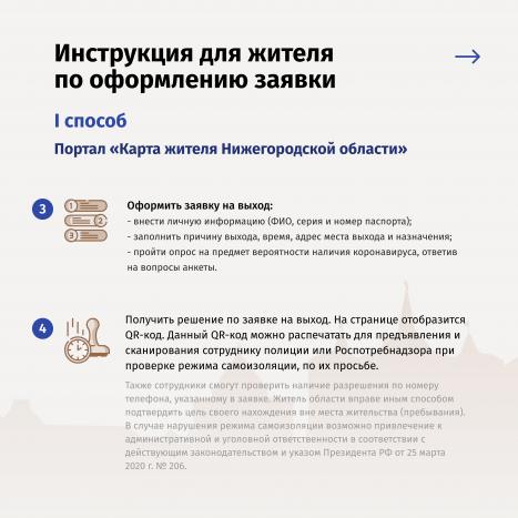Согласно тексту Указа гражданам для того, чтобы покинуть свое место проживания (пребывания), необходимо оформить заявку с помощью сервиса «Карта жителя Нижегородской области», размещенного на портале nn-card.ru. Гражданам, не имеющим в пользовании смартфонов, подачу заявок на перемещения вне места жительства (пребывания) нужно осуществлять по единому номеру «112» в Нижегородской области. Граждане, не имеющие смартфонов, но осуществляющие перемещения в сопровождении волонтеров, у которых есть соответствующее подтверждение, полученное с использованием сервиса «Карта жителя Нижегородской области», имеют право не оформлять заявку на выход за пределы места проживания.