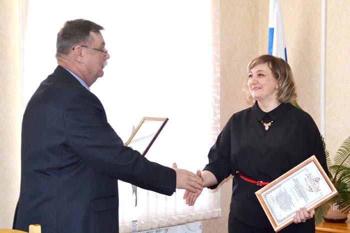 На фото: На производственном совещании глава администрации района В.Ю. Мозонов вручил директору Детского оздоровительного образовательного центра «Озерный» Т.Г. Рожновой диплом правительства Нижегородской области за 1 место в ежегодном областном конкурсе «Лучший работодатель» в номинации «Кадровый потенциал» (за содействие в трудоустройстве несовершеннолетних граждан в возрасте от 14 до 18 лет в свободное от учебы время и выпускников учебных заведений). Центр «Озерный» также награжден дипломом Управления государственной службы занятости населения области, как занявший второе место в областном конкурсе трудовых подростковых бригад в номинации «Лучший работодатель». Трудовая бригада «Эколагерь» школы имени С.И. Образумова за участие в номинации «Зеленый патруль» отмечена благодарственным письмом Управления службы занятости населения области. Благодарственным письмом Управления по труду и занятости населения Нижегородской области за участие в конкурсе «Лучший работодатель производственной сферы» в номинации «Партнер года» отмечено АО «Сапфир».