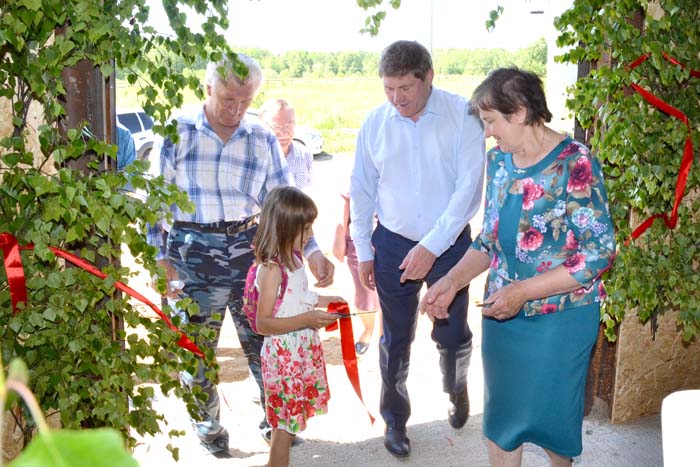 В самый торжественный момент ножницы для перерезания красной ленточки на входе в новый коровник Николай Константинович неожиданно для всех передал внучке фермера, первокласснице Ульяне. Она на радость собравшихся справилась с этим непривычным для нее делом успешно.