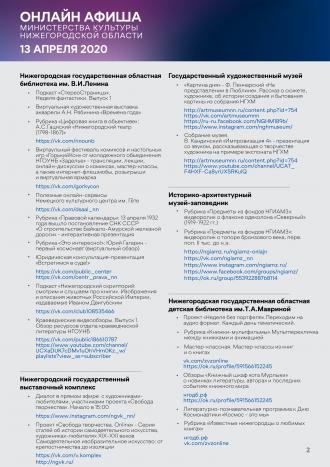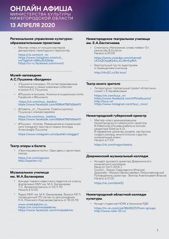 13 апреля в нижегородских музеях, театрах, библиотеках и других учреждениях культуры пройдут просветительские онлайн-проекты. Афиша предстоящих событий размещается на официальных страницах учреждений, а также в их аккаунтах в соцсетях.