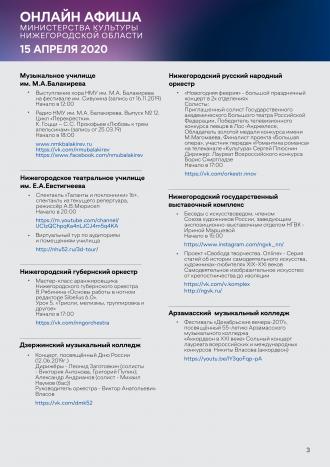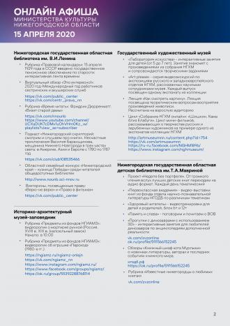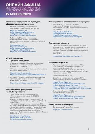 15 апреля в нижегородских музеях, театрах, библиотеках и других учреждениях культуры пройдут просветительские онлайн-проекты. Афиша предстоящих событий размещается на официальных страницах учреждений, а также в их аккаунтах в соцсетях.