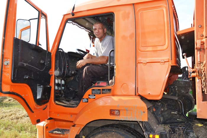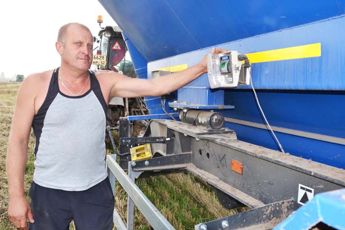 – В уборке активно используются восемь зерноуборочных комбайнов: три Джон Дира, три Массея, Акрос и Клаас, четыре Камаза, два Т-150, два-три Белоруса с восьмитонными телегами и перегрузчик. Последний идеально подходит для ускорения разгрузки комбайнов и транспортировки зерна, – поделился Виктор Проняев. – Ни малейшего простоя. Зерно, выгруженное из бункеров комбайнов, из перегрузчика, вместительностью 24 т, с помощью шнека подается в кузовы и телеги с производительностью 300 т в час. И это еще не все. Загрузив Камаз или трактор, погрузчик выдает чек, в котором с точностью указан вес пересыпанного зерна. Весами на колесах называет перегрузчик Сергей Конокин, работающий на нем.