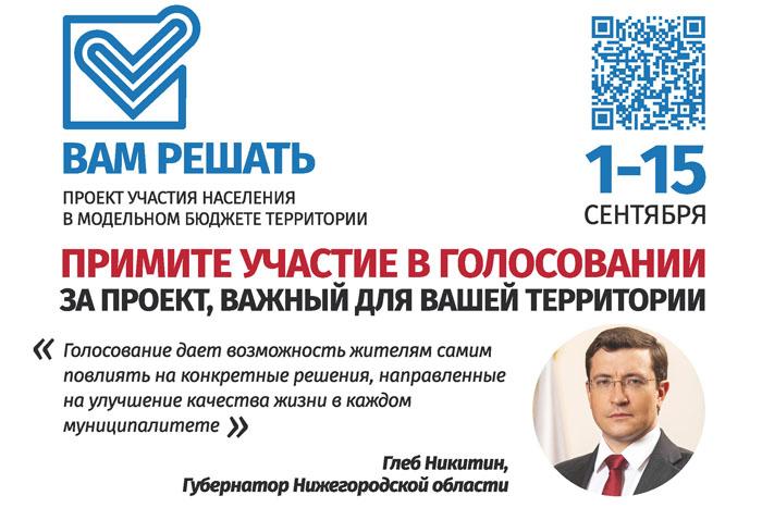 Отбор будет производить население, принимая участие в формировании модельных бюджетов территорий. Жители района смогут проголосовать за понравившийся проект, который они посчитают наиболее важным, с 1 по 15 сентября на портале «Бюджет для граждан» (http://mf.nnov.ru:8025/). Там же можно будет и ознакомиться с проектами.