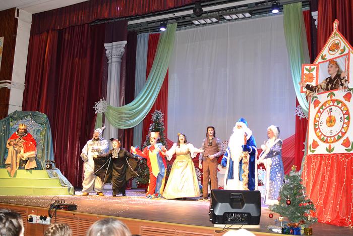 ВСЕХ приятно удивили актеры театра РДК. Детвора с интересом наблюдала за волшебством и новогодним переполохом, происходившими в сказочном королевстве. Коварная Летучая Мышь с трусливым другом Крысом украли в королевстве волшебный ключик от часов с Кукушкой. Часы на время остановились, и это доставило радость сказочным воришкам. Тем самым они хотели лишить главного праздника детишек. И поначалу заколдовали жителей королевства – Пса-сыщика, Шута и Принцессу – которые бросились на их поиски. Но Король позвал на выручку Деда Мороза и Снегурочку. И чудо свершилось – злодеи-воришки испугались снежной вьюги, которую устроил Дед Мороз, и ключик от часов оказался в руках жителей королевства. А затем актеры театра пригласили всех в танцевальный зал, где дети стали главными участниками рождественского приключения. Со сказочными персонажами Поросенком, Мышкой, Шутом, Старушкой-путешественницей водили хоровод, пели, резвились, ловко преодолевали «волшебный туннель». Возле сверкающей огнями елки радовались встрече с Дедом Морозом и Снегурочкой, которые принесли подарки.