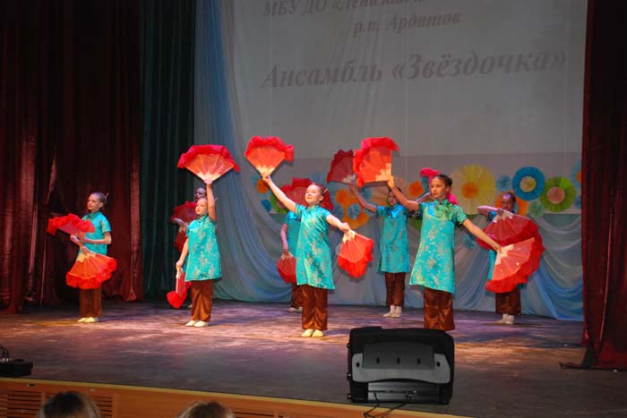 Наш район представляли детские ансамбли «Барбарики» и «Звездочки» (преподаватель Ардатовской ДШИ А.В. Мураталиева). Самым маленьким участникам «барбарикам» предоставили возможность открыть фестиваль. Своим исполнением танцев народов мира и «ласточек» они вызвали у публики самые приятные эмоции. Без умиления за ними наблюдать было просто невозможно! Они же, не первый раз выступая на сцене, ритмично двигались в танце и выглядели очень достойно. Как, впрочем, и ансамбль «Звездочки» с танцами «Арабские сказки» и «Вьетнамское диско». Выступления ардатовских коллективов в красочных костюмах и с яркими танцевальными атрибутами стали настоящим украшением фестиваля.