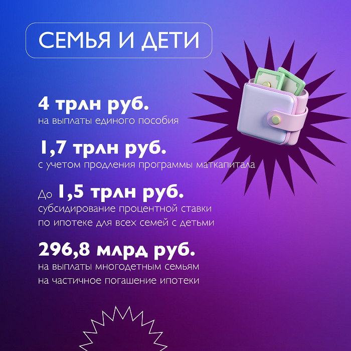Особое значение в рамках социальной политики уделяется адресной помощи семьям с детьми. По поручению президента России разработана система поддержки, охватывающая всех нуждающихся от момента беременности до достижения ребенком 17 лет. Эта программа коснется около 10 млн человек, что подчеркивает масштаб и важность государственной поддержки семей.