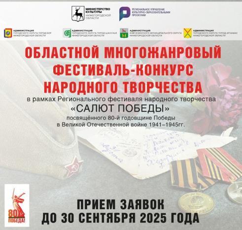 В Нижегородской области стартовал прием заявок на участие в областном многожанровом фестивале-конкурсе народного творчества, который проводится в рамках регионального фестиваля «Салют Победы», посвященного 80-летию Победы в Великой Отечественной войне. Об этом сообщает министерство культуры Нижегородской области.