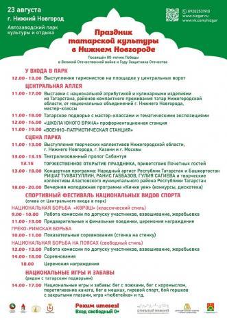 23 августа 2025 года в Центральном парке культуры и отдыха Автозаводского района Нижнего Новгорода состоится праздник татарской культуры. Начало программы — в 11.00, торжественное открытие — в 13.00. В этом году мероприятие посвящено 80-летию Победы в Великой Отечественной войне и Году защитника Отечества.
